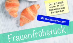 Frauenfrühstück am 5.3.26 im Gemeindehaus Sulz am Eck um 9 Uhr. Thema: „Trauernden begegnen und begleiten – Praktische Hilfestellungen im Umgang mit trauernden Menschen“ mit Sr. Anne Messner. Mit Kerzenverkauf!