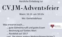 Herzliche Einladung zur CVJM-Adventsfeier: Am 16.12. um 18 Uhr im Gemeindehaus: Gute Gemeinschaft und gutes Essen, Besinnung auf Gottes Wort, Rückblick auf 2017 und „Die etwas andere Weihnachtsgeschichte“!